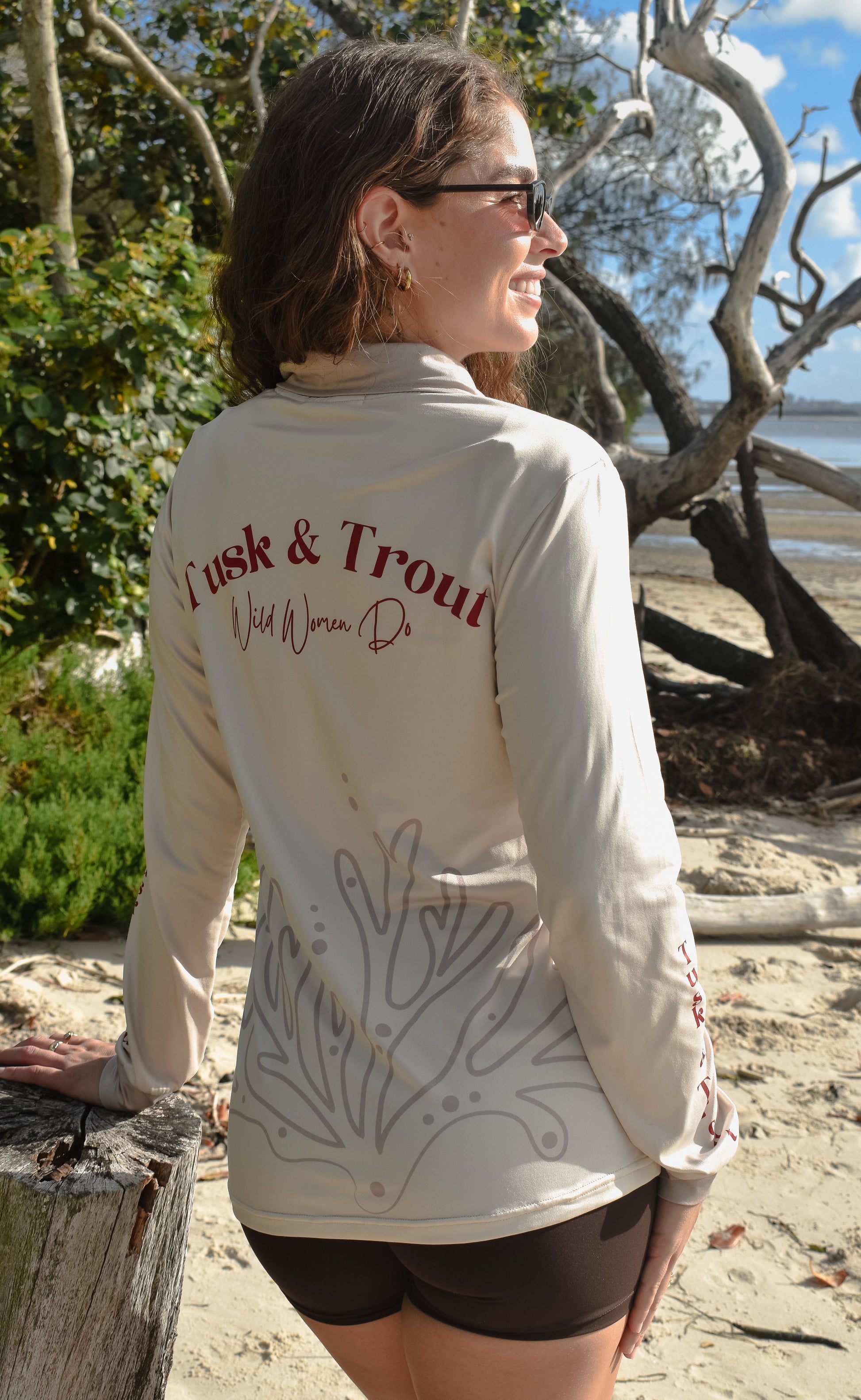 With a sleek, minimal design in earthy neutral tones, this jersey features subtle contrast detailing at the collar and cuffs for a refined finish. The women’s tapered cut flatters the body while allowing full freedom of movement, and a reef-inspired graphic adds a signature Tusk & Trout touch. Finished with custom-branded buttons and quick-drying performance fabric, Sandy Coral is built for FNQ summer days on and off the water.